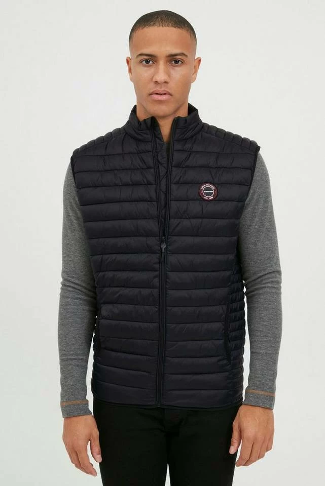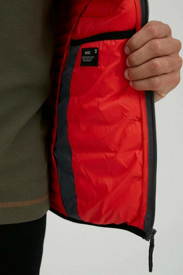 DETAILS & HIGHLIGHTS: Steppweste, leicht wattiert, mit kurzem Stehkragen, Verschluss mit Reißverschluss, zwei Eingriffstaschen, elastische Saumabschlüsse, Gummi Patch auf der linken Brustseite, farblich abgesetztes Lining in orange, leichtes und angenehmes Material.