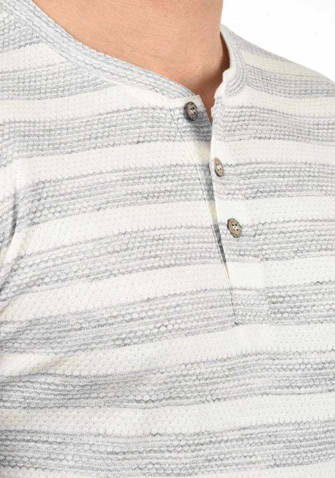 DETAILS & HIGHLIGHTS: Grandad-Ausschnitt mit Knopfleiste (Kokosknöpfe), Streifen Optik meliert in Wabenmuster, Waffel-Struktur, Kunstleder-Patches am hinteren Saum und an der Seitennaht