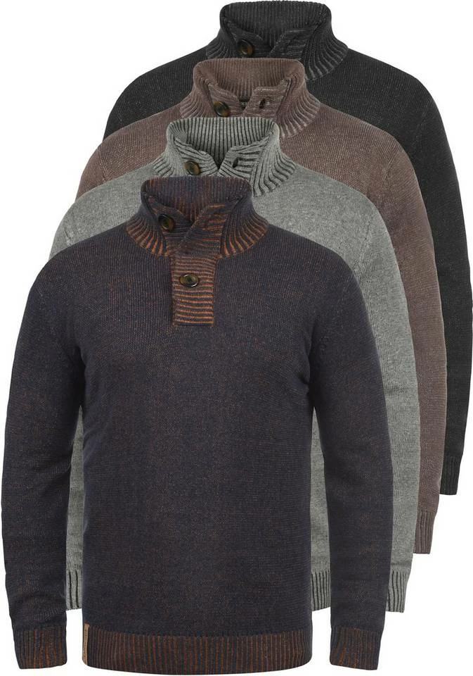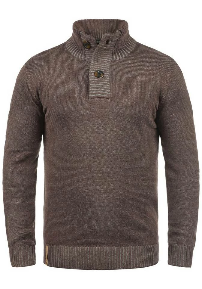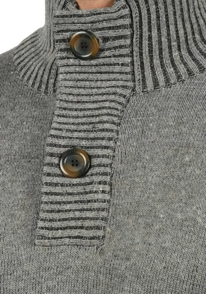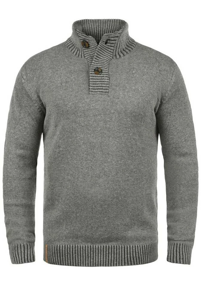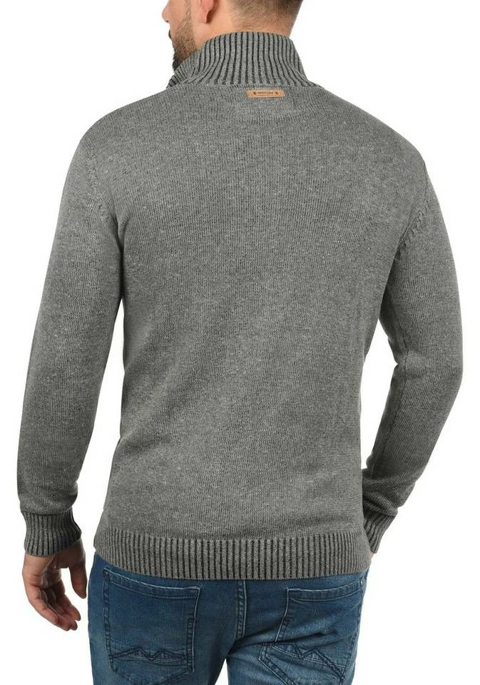 DETAILS & HIGHLIGHTS: Gerippter Stehkragen (Troyer) mit Knopfleiste, feinmaschig gestrickt, Melange Optik, gerippte Ärmelbündchen sowie Saum, Kunstleder-Logopatch am Abschlussbund sowie hinten am Kragen